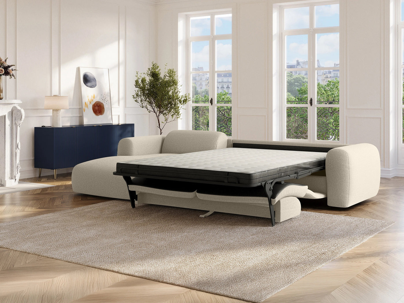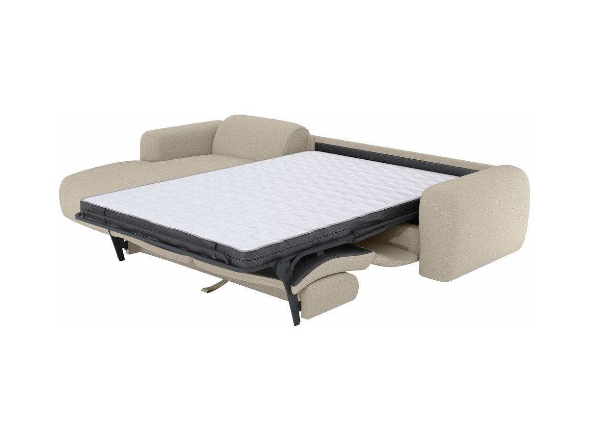 De plus, découvrez une assise avec un garnissage haute résilience, qui offre un maintien régulier et soutient confortablement les moments de détente. Le canapé se déploie en un geste et crée un espace de sommeil adapté aux besoins du quotidien. En effet, le couchage profite d’un matelas doté de mousse à mémoire de forme, une technologie qui épouse les zones de pression et améliore la qualité du repos nocturne.
